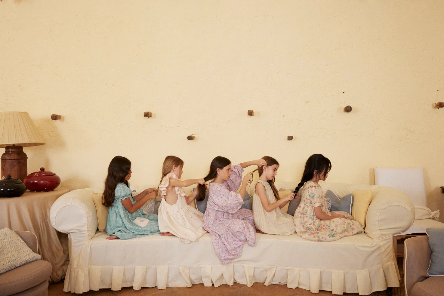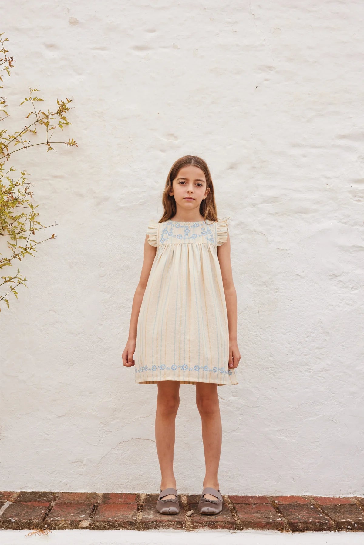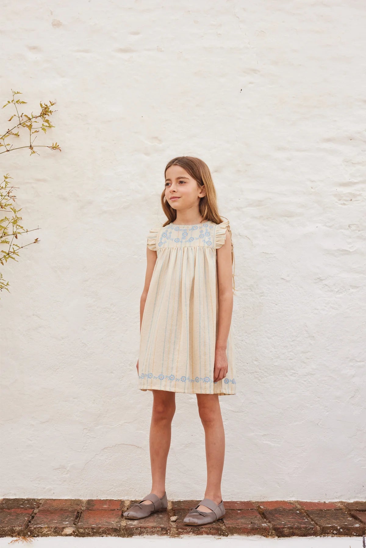 Ode to a nostalgic childhood. Introducing lovely Lena dress in adorable summer stripe fabric. Crafted from the softest rustic cotton. Features gently ruffled butterfly sleeves and lovely blue floral embroidery on the chest and hemline. The neckline is finished with an adorable handmade crochet. Dress is lined with soft cotton voile. As usual, a flouncy skirt - perfect for twirling.
