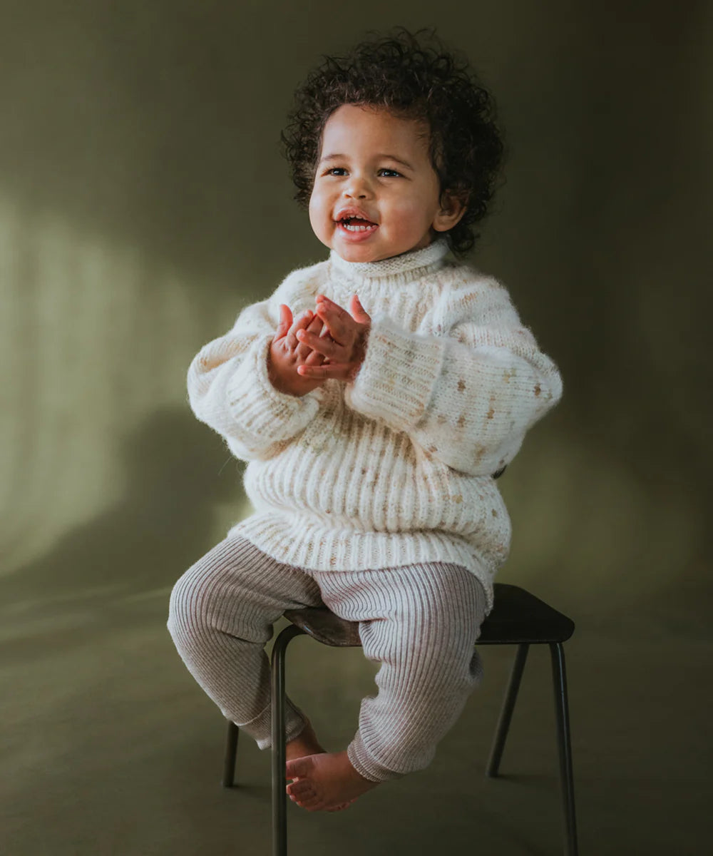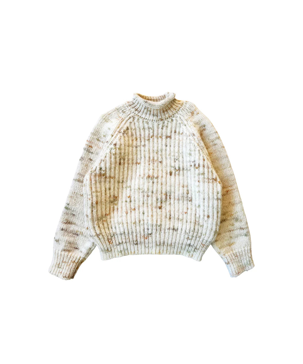 Knitted in a plain knit stitch, in a speckled cloud-like light yet chunky yarn.