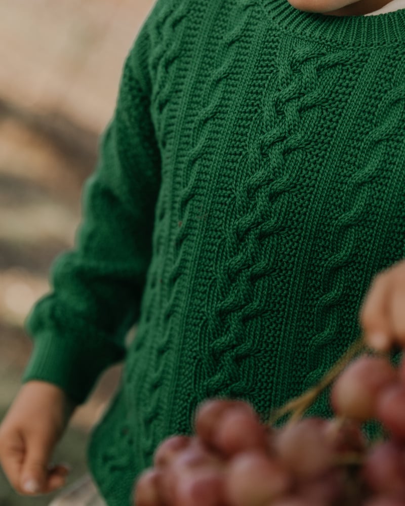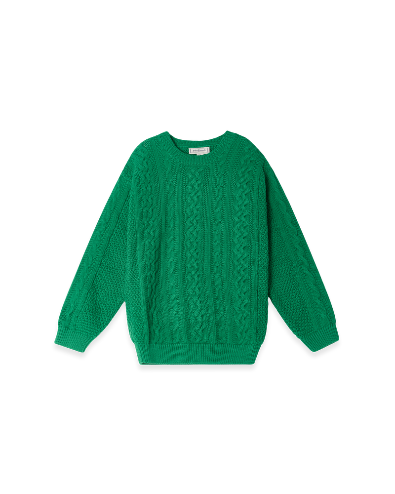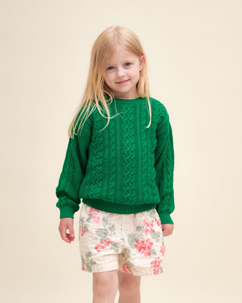 Cable knitted sweatshirt in soft organic cotton quality. The sweatshirt has a round neckline and ribbed cuffs at sleeve edges and at the hem.