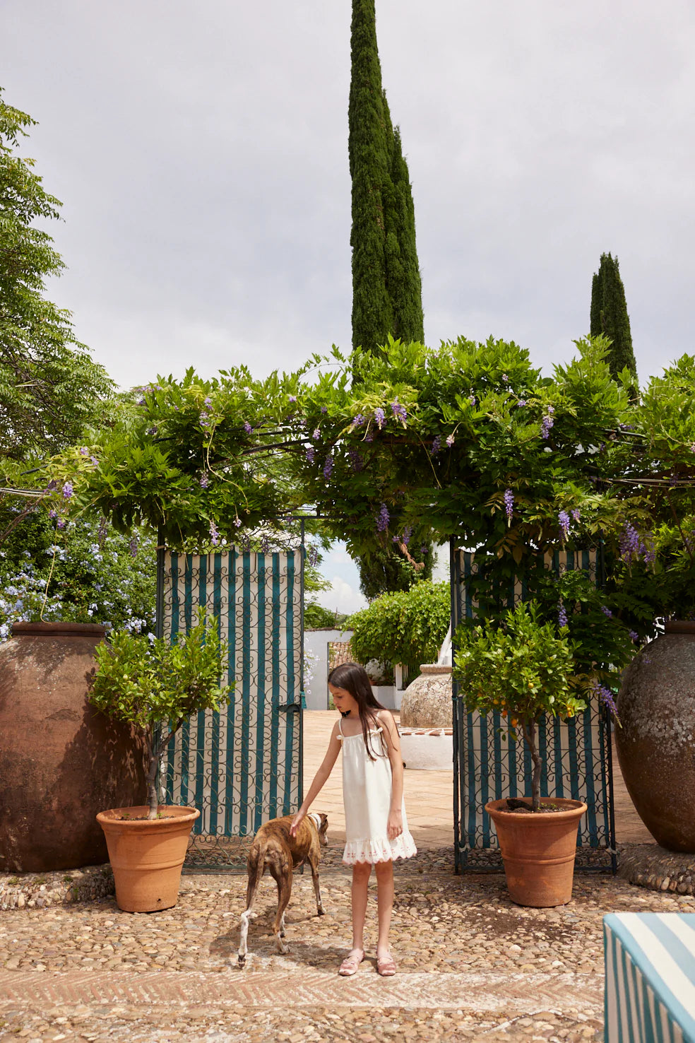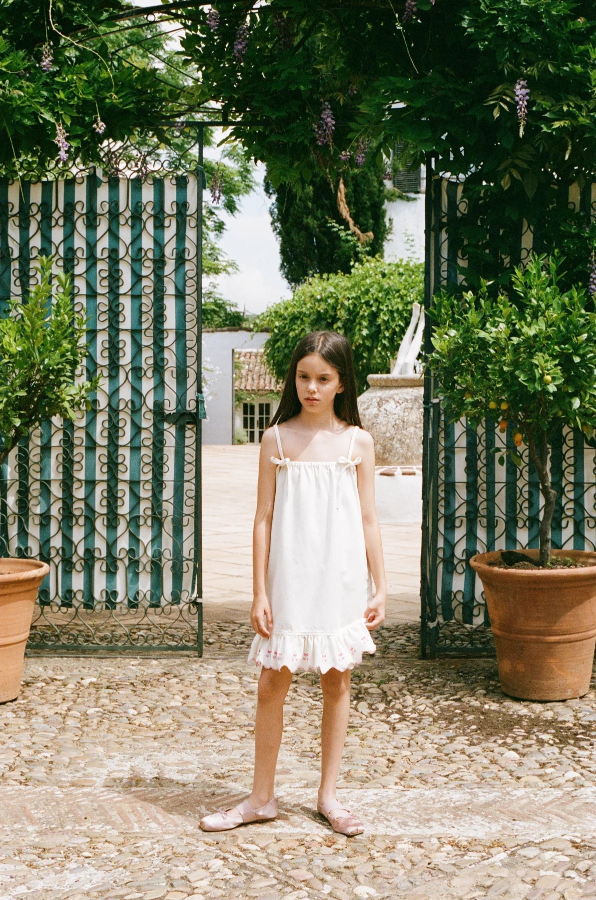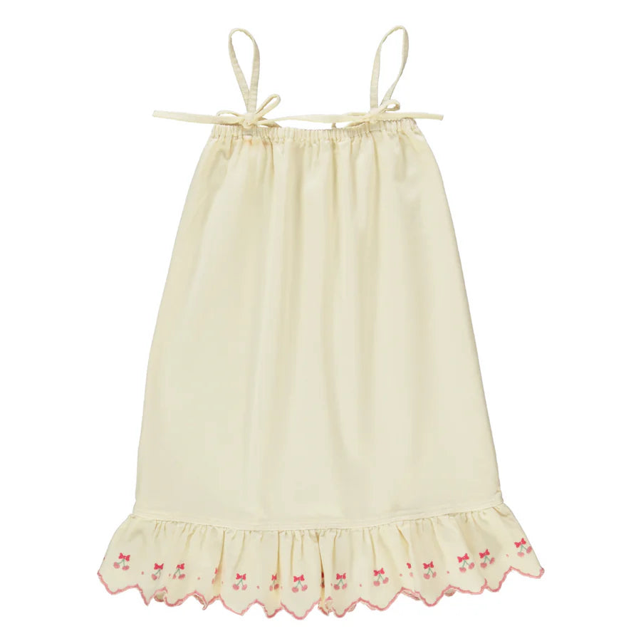 Simply adorable Cerise dress in natural denim is a perfect dress for warm-weather outings. To be worn on its own or over a t-shirt or blouse. New silhouette features delicate bow straps at front, ruffled hemline with signature cherry embroidery of the season and a relaxed fit for ultimate comfort.