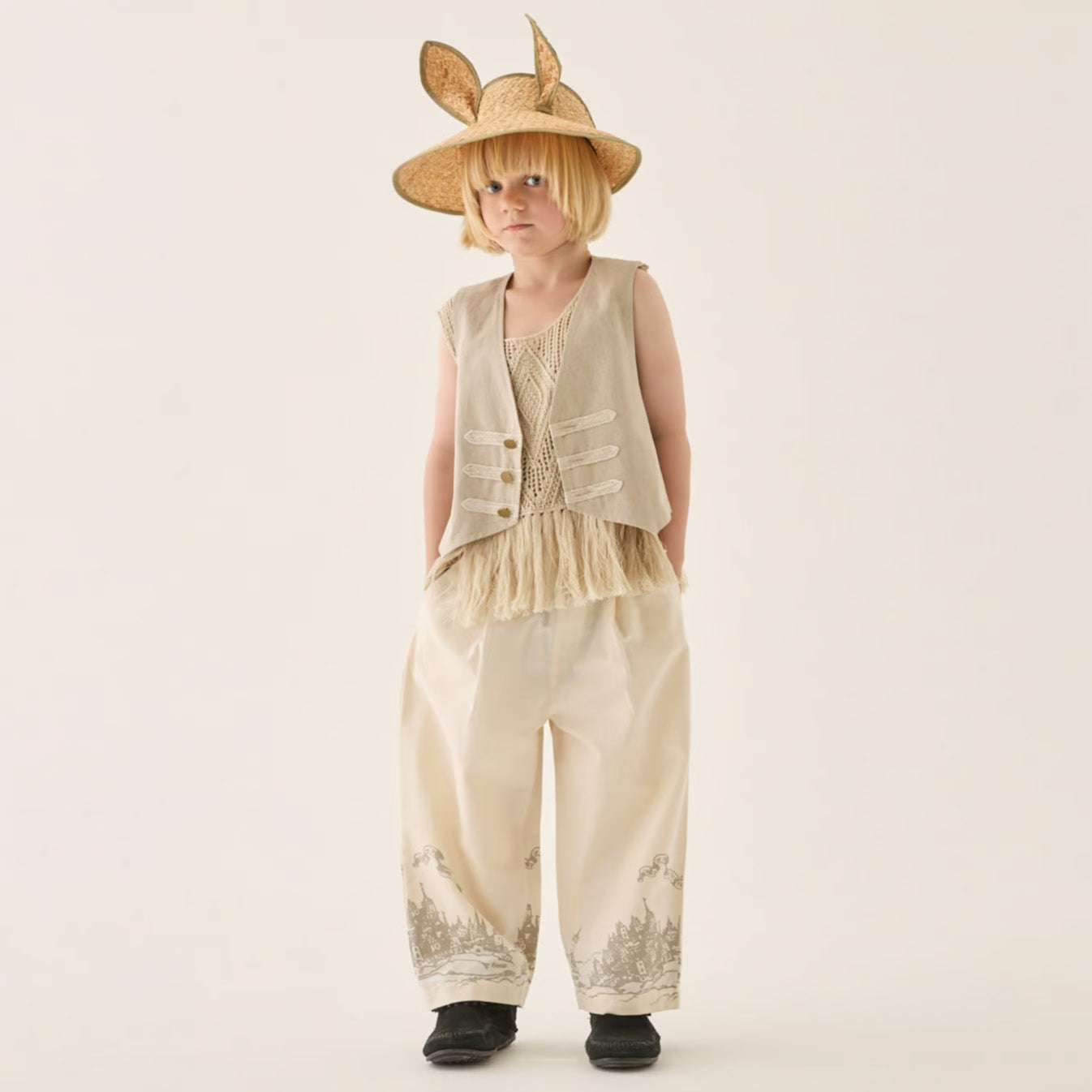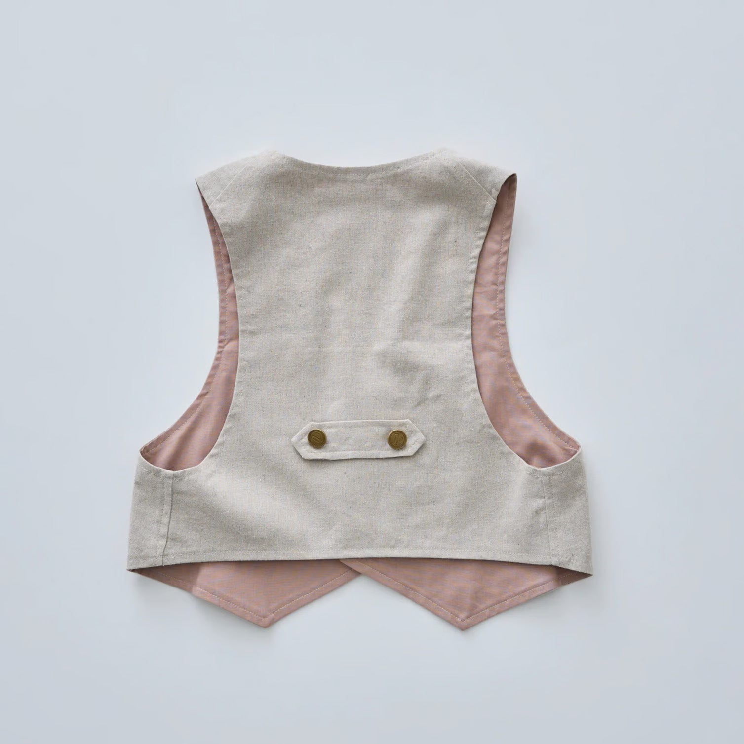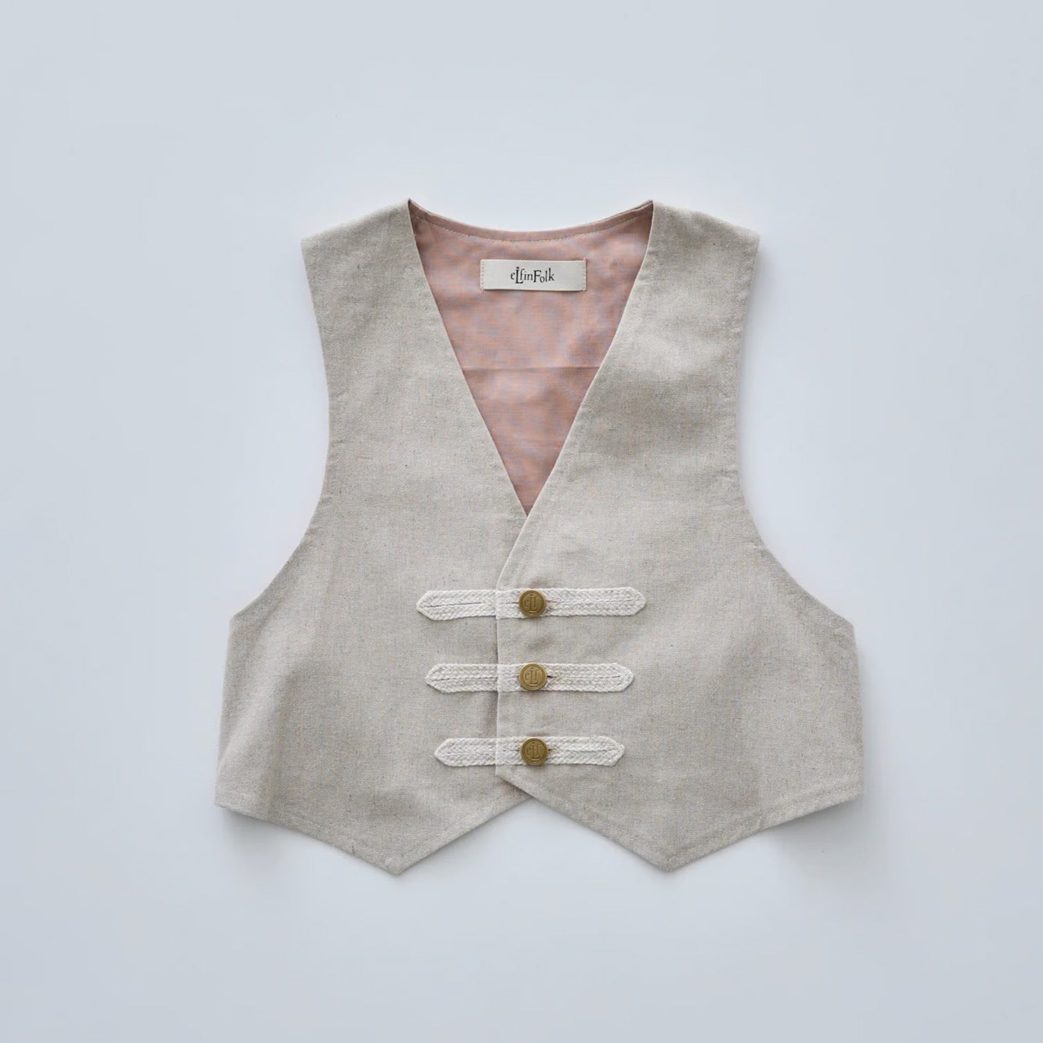 A vest made of cotton-linen canvas fabric, decorated with linen tape in a natural linen color to evoke the image of a Napoleon jacket. The lining is made of cotton sheeting.
