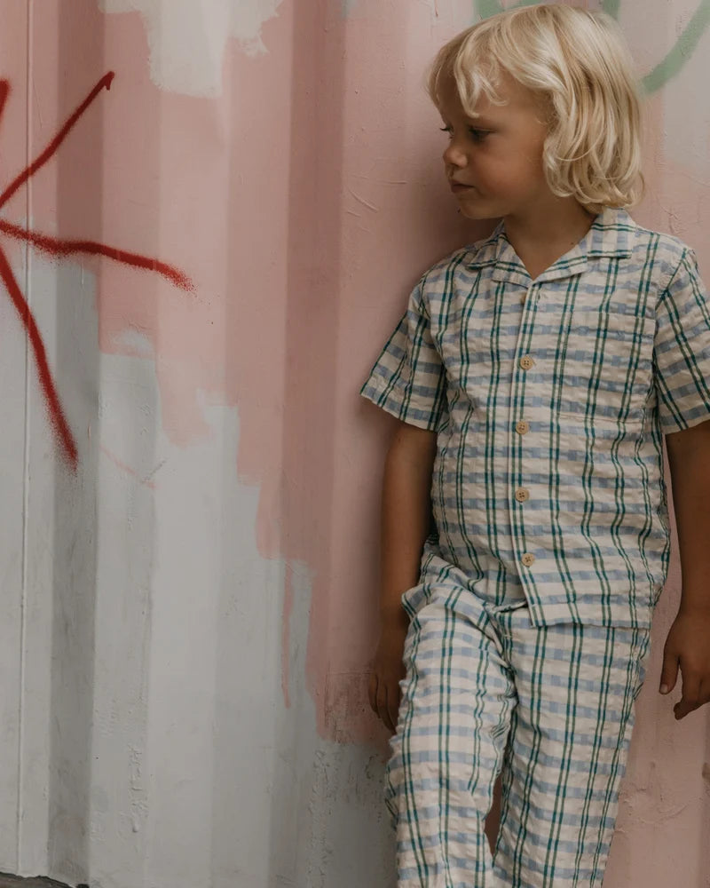 Short-sleeved shirt in a light cotton seersucker quality with collar. The shirt has button closure and a sewn-on chest pocket at the front. Perfect to combine with our muslin shorts, skirt or trousers.